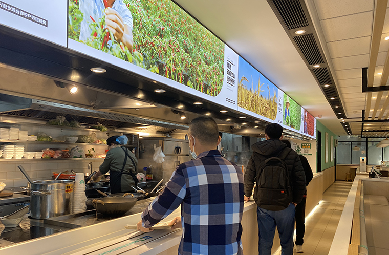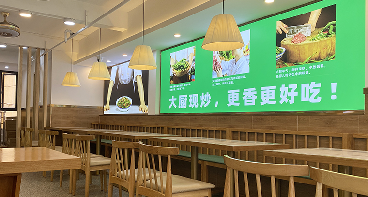 為了使門(mén)店效果最大化,在立面的墻面上可以做一些精美的廣告燈箱畫(huà)面,超薄軟膜燈箱,用一些高精度的精美大圖,內(nèi)容或與品類相關(guān),或與品牌文化有聯(lián)系,或是表現(xiàn)菜品核心特色。讓顧客在用餐之余,還能欣賞并閱讀我們的產(chǎn)品。