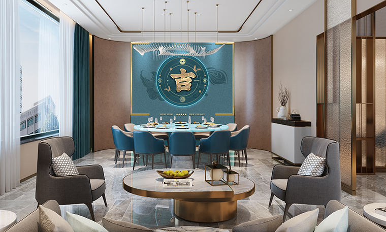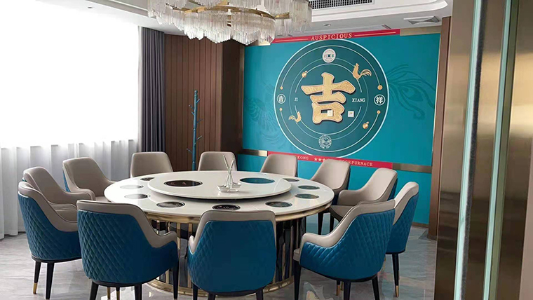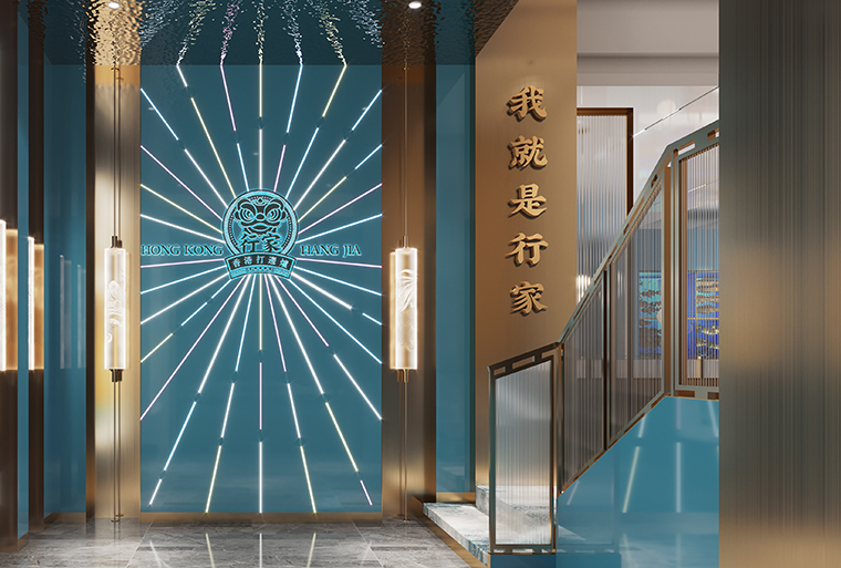 行家花膠雞港式打邊爐餐廳在顏色設(shè)計(jì)上結(jié)合品牌色,大面積使用不銹鋼金色,藍(lán)綠色,暗紅色,將餐廳打造成主題風(fēng)格截然不同的港式餐廳,同時(shí)融入具有地域風(fēng)情的港式風(fēng)味,在文化元素上植入恭喜發(fā)財(cái),順、發(fā)、喜等傳統(tǒng)香港吉祥話語元素,傳統(tǒng)與現(xiàn)代的元素融合在餐飲空間中,突破了人們對(duì)傳統(tǒng)港式餐廳的認(rèn)知,重新定義新派港式打邊爐餐廳的基調(diào)。