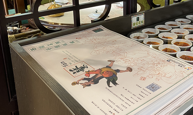 此次海報設計有六個連續畫面,正好適合推廣明星款產品。因蘩樓的產品本身就有較強的藝術美感及傳頌效果,綜合店長及蘩樓主廚師建議,我們選取了6款產品來作為本次海報主題畫面,每一款海報主推一款明星產品,以連續陣列式畫面排開,顧客路過通過6個重復品牌畫面+強調明星產品的形式,視覺震撼,很容易形成對蘩樓的品牌記憶。