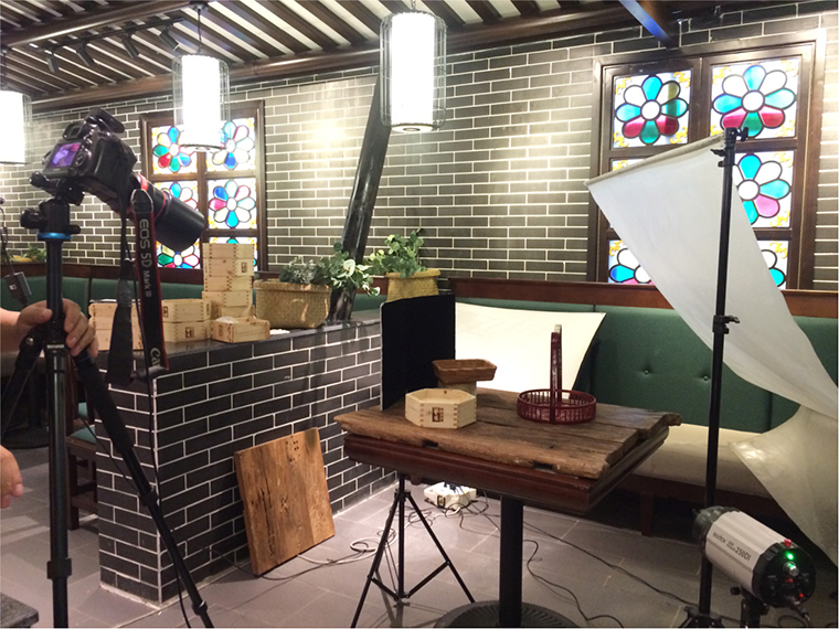 基于此我們制定詳細產品拍攝的方案,決定對產品的主桌面背景用老榆木來搭配,我們認為肌理感強,質樸悠久老榆木可承托出點心產品的手工技藝,也