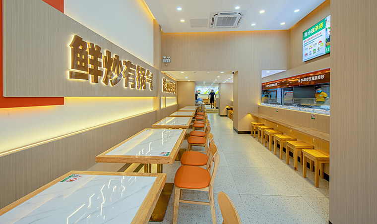 門口大面積落地玻璃、墻面使用板材、白色大理石打菜臺、灰色地面、木色桌面,橙色亞克力板。整個空間追求明亮、整潔、舒適的視覺感受。尤其是門口的落地玻璃,窗明幾凈,讓路過的消費者都能看見店內熱火朝天的狀態,鍋氣繚繞的煙火氣,產生強烈的進店沖動。