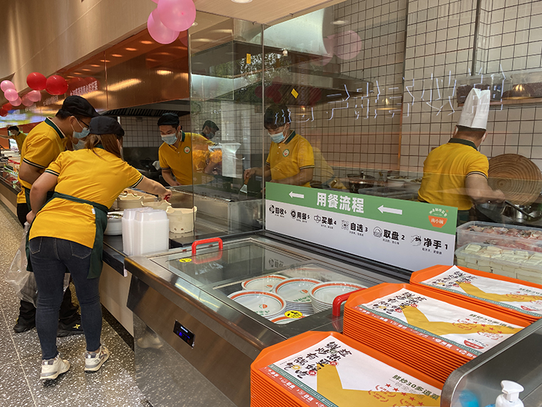 顧客進門洗手,取餐盤自助選菜,找位置就餐,餐具回收,整個動線清晰流暢,運作一氣呵成。選菜臺的設計非常驚艷,30多到菜品排列成一行,在燈光照射,非常有吸引力。讓消費者產生一種想全部吃一遍的沖動,進而胃口大開,長期光顧我們。