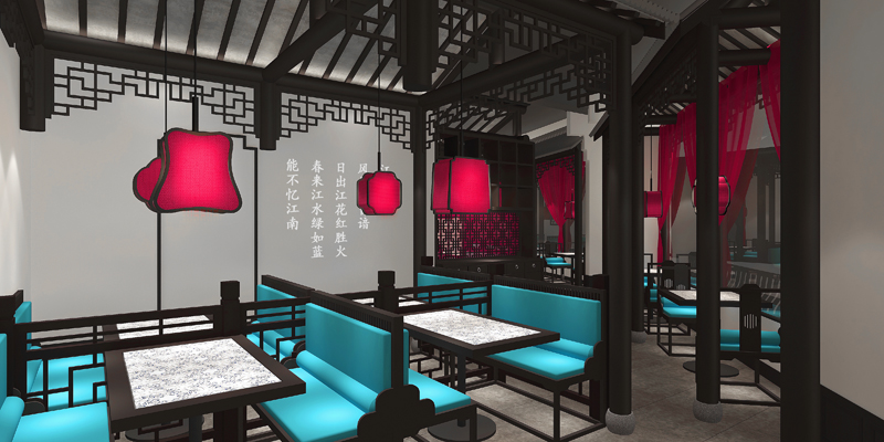如:品深餐飲設計過的二小姐的店,從蘇杭古典園林中獲取靈感元素,將江南園林中“連廊”的建筑形式引入項目空間中,并與不同的座椅形式完美組合,營造出室外廊下的用餐體驗場景化的設計。將江南的粉墻黛瓦,飛檐翹角,通過剪影化的設計手法,成為空間立面的裝飾造型元素。長形的沙發座椅靠背設計借鑒江南建筑的欄桿造型(又稱美人靠),與背景的建筑剪影形成形式的完美統一。并將江南的水色山光,山嵐煙云,通過淡墨山水的形式移植進餐廳的墻面,作為整個餐廳的背景,