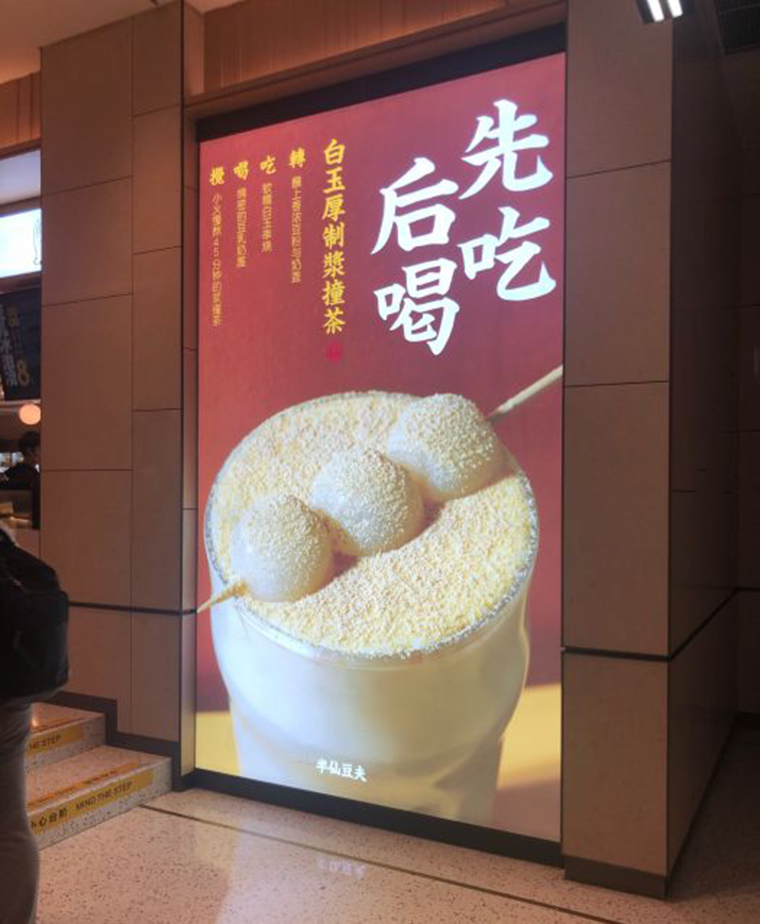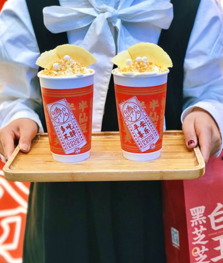 在出品上注重儀式感,豆漿出品前用一串日本白玉丸子橫在杯子上,并撒上豆粉,儀式感滿滿,白玉丸子蘸上香濃豆粉與奶蓋,先吃軟糯白玉串燒,再喝綿密的豆乳奶蓋,成功地把豆漿變成能吃的豆乳茶,引來顧客爭相拍照打卡,一時間成為網紅產品。