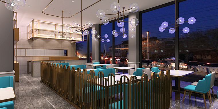 港灣茶餐廳內(nèi)部裝飾盡量簡(jiǎn)潔為主,沒有繁復(fù)的線條,整裝護(hù)墻板采用高級(jí)灰,時(shí)尚感強(qiáng),藍(lán)綠色的招牌外觀,純鐵藝格柵,金色鍍銅架,整體氛圍休閑時(shí)尚,富有網(wǎng)紅特質(zhì)。