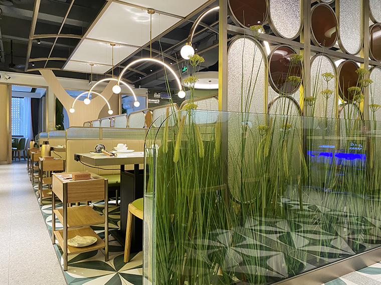 我們想到了磨砂玻璃這一材質,在餐廳立面的隔斷、包間的墻體,我們使用了磨砂玻璃及玻璃方磚,這種材料在燈光照耀下,有一種晶瑩剔透的感覺,用裝飾材料特性表現菜品清湯這一核心特征,打造出時尚清新,通透舒適的空間感受。