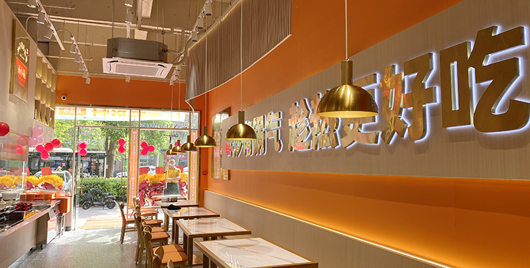 2、門(mén)口大面積落地玻璃、墻面使用板材,白色大理石臺(tái)面、灰色地面、木色桌面,橙色亞克力板。整個(gè)空間追求明亮、整潔、舒適的視覺(jué)感受。尤其是門(mén)口的落地玻璃,窗明幾凈,讓路過(guò)的消費(fèi)者都能看見(jiàn)店內(nèi)熱火朝天的狀態(tài),鍋氣繚繞的煙火氣,產(chǎn)生強(qiáng)烈的進(jìn)店沖動(dòng)。