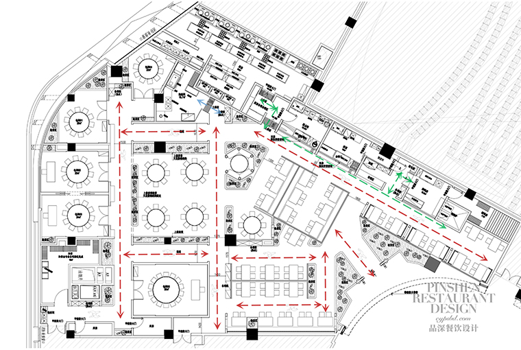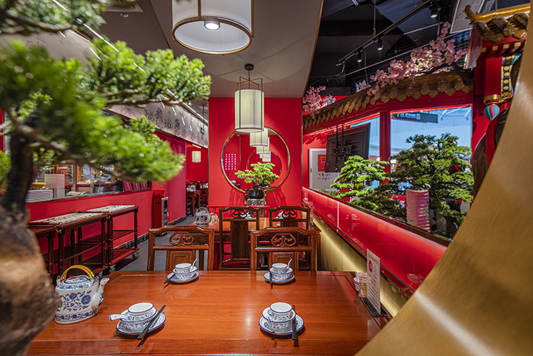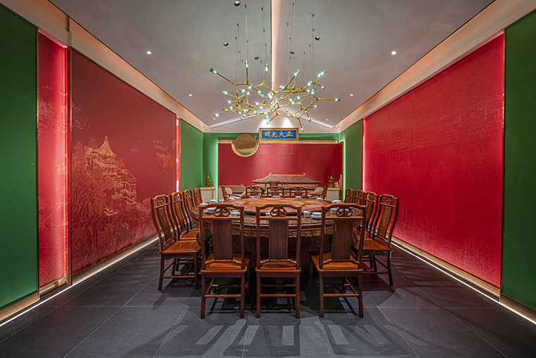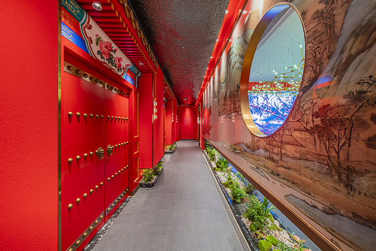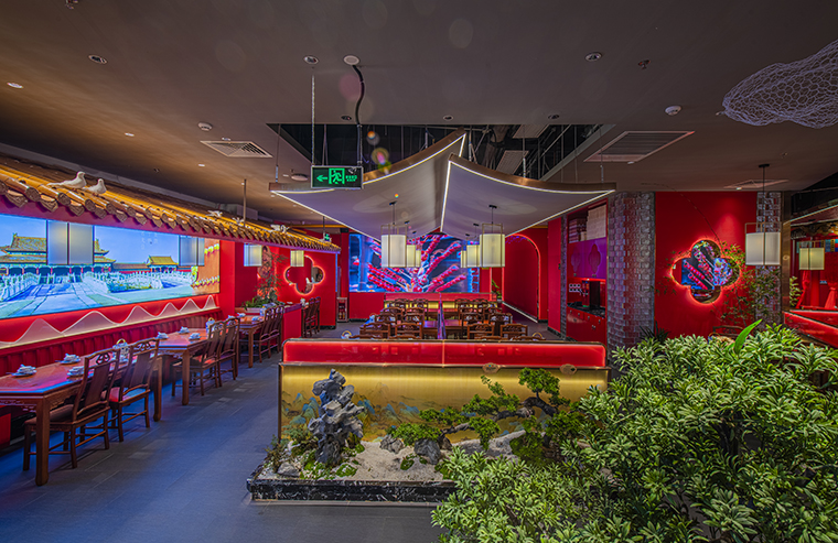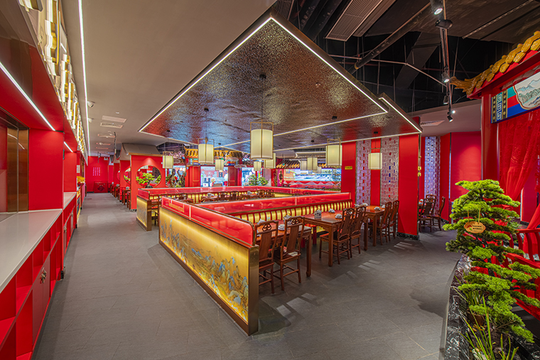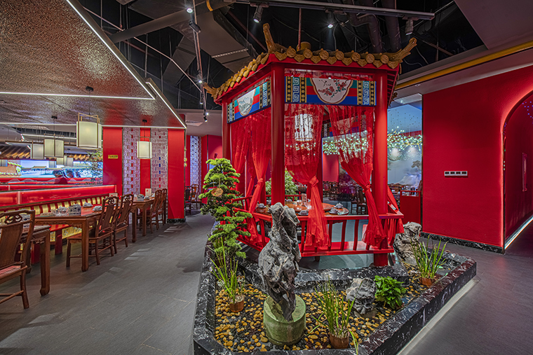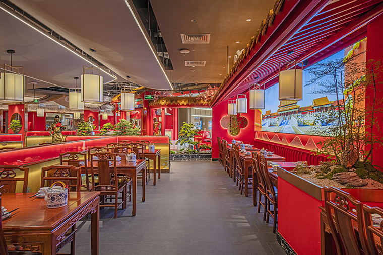 1、本項目為京味張東莞大朗碧桂園里悅里店,總面積約829平方米。用中國紅強化品牌內(nèi)含的北京皇城文化,令人印象鮮明;