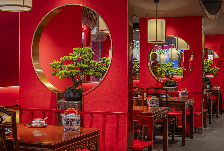 門口的迎賓人,提籠遛鳥人,跑堂人等雕塑銅人將老北京烤鴨飲食文化自然帶出;空間大量借鑒中式園林造景手法,點綴綠植,水景,框景,步移景異;