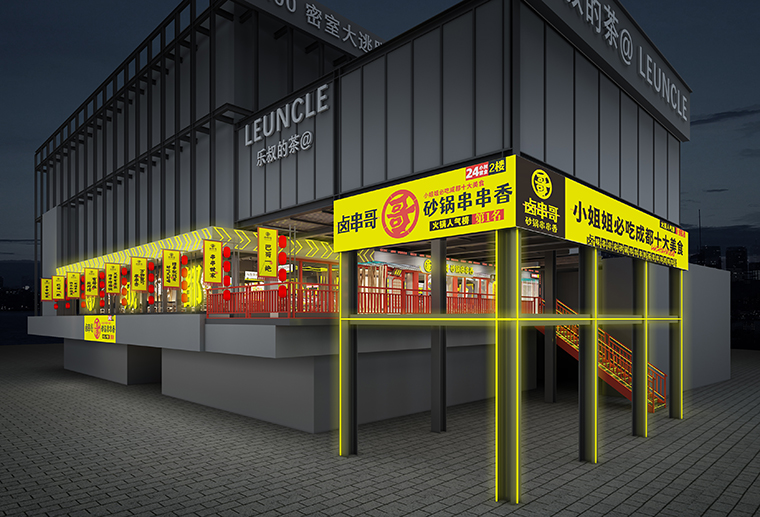 鹵串哥的好喝除了各種酒水飲料外,更有小姐姐最好吃的各種甜品。這也是鹵串哥與其他串串香火鍋產(chǎn)品結(jié)構(gòu)及經(jīng)營模式不同之處,此甜品還開設(shè)了對(duì)外售賣窗,為門店創(chuàng)造業(yè)績(jī)并吸引客流。品深餐飲全案團(tuán)隊(duì)將鹵串哥甜品間的設(shè)計(jì)視為品牌的一大亮點(diǎn),功能上設(shè)置了對(duì)外窗口,外觀用醒目的中國紅,裝飾設(shè)計(jì)上用傳統(tǒng)的屋檐造型來表現(xiàn),視覺感非常強(qiáng)烈,極具吸引力。