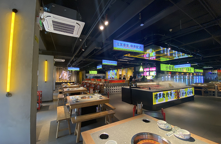 2、鹵串香火鍋對(duì)菜品照明要求不高,所以我們沒有使用吊燈,僅使用軌道射燈,滿足空間氛圍照明和功能照明即可。其他用廣告燈箱的照明來增強(qiáng)氛圍感,效果也不錯(cuò)。墻體柱子則使用了燈管暖光,性價(jià)比高,氛圍也好。