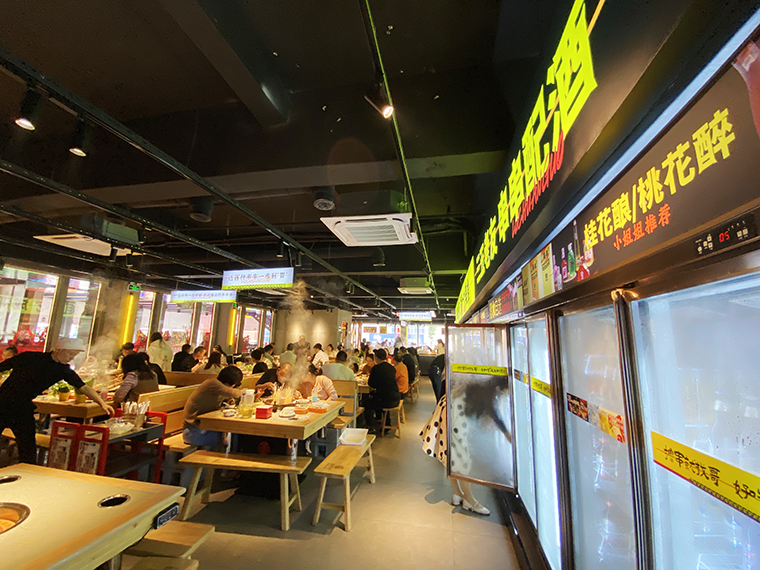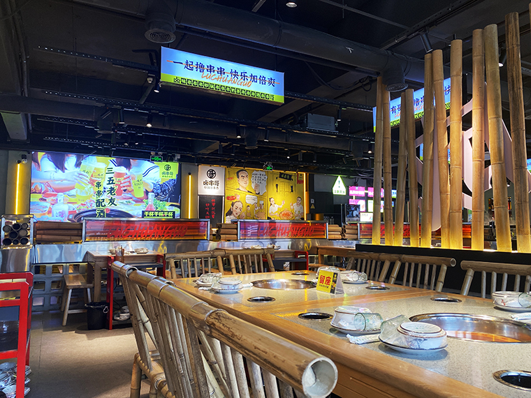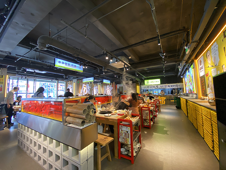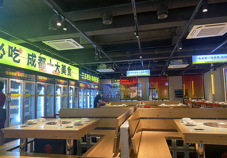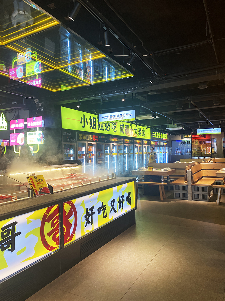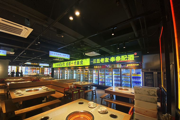 串串香火鍋的用餐特點(diǎn)比較獨(dú)特,類似自助火鍋。顧客自己到冰柜取串串,拿飲品,喜歡什么就拿什么。因此,在門店功能設(shè)計(jì)方面,取串串的冰柜是客流最密集的地方,需要給顧客展示出串串品類特別多的優(yōu)勢(shì)。