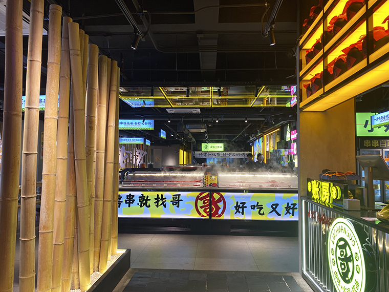 1、火鍋店就需要熱鬧的煙火氣,市井氣,鹵串哥門店一律不做吊頂,只在局部區(qū)域如甜品間、收銀區(qū)和接待區(qū)做局部裝飾;地面使用灰黑耐臟耐滑瓷磚;不做或者少做立面復(fù)雜造型,使用簡(jiǎn)單好買,性價(jià)比高的常規(guī)材料。鹵串哥用品牌強(qiáng)關(guān)聯(lián)的具體一個(gè)元素串聯(lián)整個(gè)裝飾,形成品牌專屬識(shí)別記憶。空間中我們使用了竹元素,做了一面竹墻,材料、工藝都非常簡(jiǎn)單,造價(jià)也很低廉,竹墻又與竹椅、竹簽,形成呼應(yīng)關(guān)系,與品牌傳達(dá)的袍哥人家,有節(jié)有義,高度吻合,特色非常鮮明,顧客很喜歡,紛紛拍照傳頌。