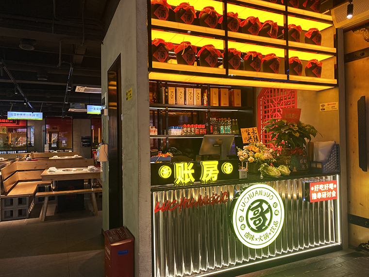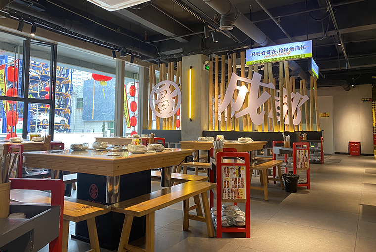 品深餐飲全案團(tuán)隊(duì)專程去成都體驗(yàn)了很多家串串香火鍋店,發(fā)現(xiàn)不少串串香火鍋藏在街頭巷尾,空間環(huán)境狹小閉窄,收納功能做得很差,各種物料都是亂放亂堆,美其名曰是煙火氣,現(xiàn)場(chǎng)感受是臟亂差,用餐非常難受。所以我們?cè)谠O(shè)計(jì)規(guī)劃鹵串哥的門店時(shí),座位分布上,8人卡座與4人散臺(tái)相結(jié)合,座椅的尺度比例比常規(guī)串串香寬闊了很多,流轉(zhuǎn)效率更高,翻臺(tái)率也更高了。