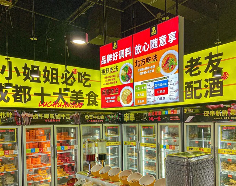4、空間門店中最醒目的就是取串串的一長溜冷鮮柜,甲方團(tuán)隊(duì)希望多用廣告畫面展示菜品賣點(diǎn),各種酒水飲料等。我們則認(rèn)為放菜品畫面太小,傳播力很弱,圖片也分散,關(guān)注度更低。我們直接用一句話語來傳達(dá):小姐姐必吃成都十大美食。既討巧了我們的主流客群,也用成都這一大IP來背書。很特別,很震撼,效果當(dāng)然更好。其他需要傳達(dá)的信息如產(chǎn)品價(jià)格、產(chǎn)品核心賣點(diǎn),我們都用背膠貼的形式,貼在冷鮮柜門上,廣告效應(yīng)顯著。