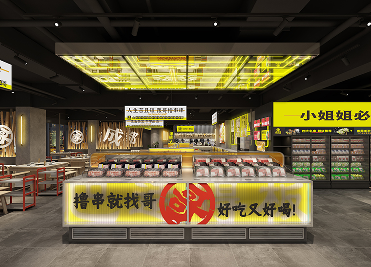 品深將其設(shè)計(jì)出連續(xù)長排展示,讓顧客有一種想征服美食的欲望。鹵串哥堅(jiān)持的是串串每日新鮮現(xiàn)串,這是鹵串哥菜品的顯著特點(diǎn),我們將其設(shè)計(jì)成明檔,命名為:串串吃法研修堂。讓顧客對(duì)新鮮能親眼所見。