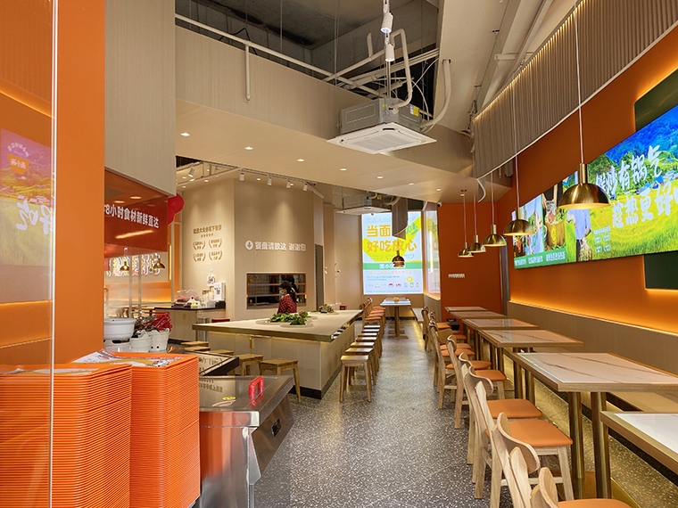 整個空間去掉復雜的線條,多余的裝飾,沒有吊頂,造價成本可控,工期也比較快,空間感受非常的明亮,通透,干凈,舒適。很好地傳遞了南小碗簡餐新鮮、安全、衛生的特點。